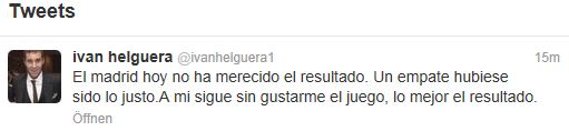 Iván Helguera spielte sowohl für Real Madrid als auch den FC Valencia. Sein Herz schlägt aber natürlich für den Verein aus der spanischen Hauptstadt, bei dem er unter anderem die UEFA Champions League gewann. Via Twitter (@ivanhelguera1) gibt der inzwischen 37-Jährige regelmäßig seine Meinung zu den Leistungen des Mourinho-Teams preis. So auch nach dem heutigen 2:0-Pokalerfolg der Blancos über die „Fledermäuse“. „Madrid hat dieses Ergebnis nicht verdient. Ein Unentschieden wäre gerecht gewesen. Mir gefällt das Spiel der Mannschaft weiterhin nicht, das Beste ist noch das Resultat“, zeigte sich der frühere Innenverteidiger von dem Auftritt des weißen Balletts alles andere als angetan.