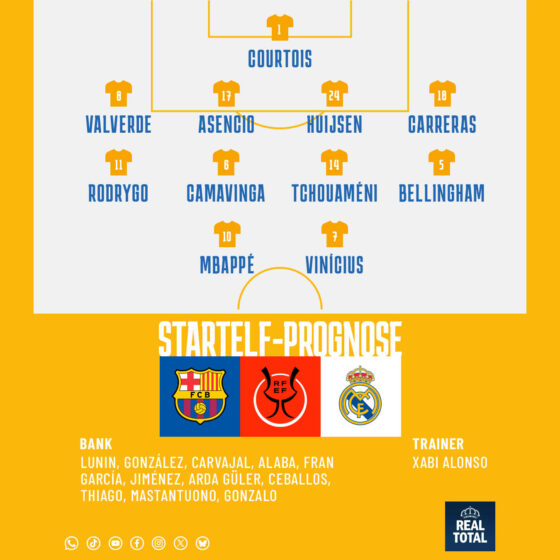 - Alles blickt auf Kylian Mbappé! Der Franzose, der wegen einer Verstauchung im linken Knie weder beim Liga-Jahresauftakt gegen Betis noch im Supercopa-Halbfinale gegen Atlético dabei war, ist inzwischen nachgereist und konnte auch beim Abschlusstraining mitmachen. Auch Rodrygo Goes war in der zweiten und letzten Einheit vor dem Endspiel dabei. Dafür fehlten auf der anderen Seite zwei andere Stars, die zuletzt dabei waren: Antonio Rüdiger sowie Ferland Mendy! Der Deutsche spielte bereits im Derby mit Schmerzen im Knie, dürfte also gegen Barça aussetzen, während der Franzose mal wieder angeschlagen ist. So dürfte zumindest Rodrygo gesetzt sein, und auch um Raúl Asencio gab es leichte Sorgen, aber er mischte ebenfalls im Training normal mit. So wie auch Dean Huijsen, David Alaba, Daniel Carvajal – mit Bandage am rechten Knie. Alle Drei waren zuletzt verletzt oder noch nicht ganz bereit, aber zumindest Huijsen kann sich Startelf-Hoffnungen machen, da Rüdiger wohl ausfällt.