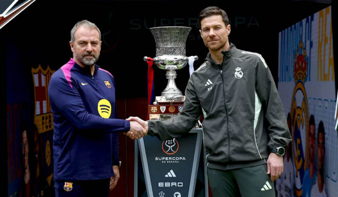 - ALONSO ERSTMALS GEGEN FLICK: Für die beiden Cheftrainer ist das Supercopa-Finale das erste Duell gegeneinander überhaupt, denn obwohl Xabi Alonso bereits einen Clásico hinter sich hat, bekam er es am 26. Oktober im Estadio Santiago Bernabéu auf der anderen Seite nicht mit Hansi Flick zu tun, sondern mit dessen Assistent Marcus Sorg. Der ehemalige Bayern-Trainer musste nämlich aufgrund einer Rot-Sperre die Niederlage seines Teams von der Tribüne aus beobachten. Und während Alonso in seiner Trainerkarriere erst zwei von drei Endspielen gewinnen konnte, hat der Deutsche die makellose Bilanz aus sieben von sieben – zwei davon mit Barça.