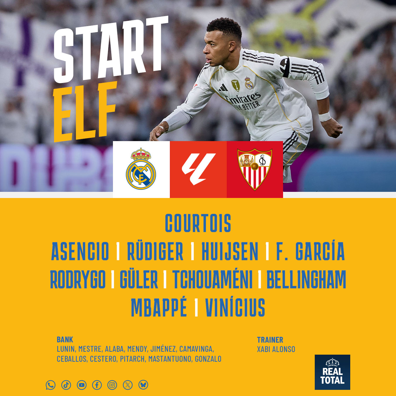 Bank: Lunin, Mestre, Alaba, Mendy, Jiménez, Camavinga, Ceballos, Cestero, Pitarch, Mastantuono, Gonzalo.