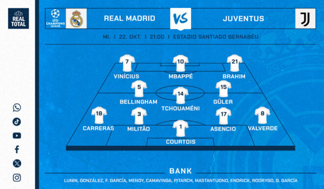 ¡HOLA A TODOS! Für Real Madrid geht es jetzt Schlag auf Schlag! Nach LaLiga steht die Champions League an – und es kommt zum Top-Spiel gegen Juventus. Die Turiner gastieren am 3. Spieltag der Ligaphase bei den Königlichen. Während die Blancos mit zwei Siegen gestartet sind, hat der italienische Traditionsklub mit zwei Unentschieden zu Beginn enttäuscht. Die ersten drei Punkte müssen her. Gibt es sie ausgerechnet im Bernabéu, nachdem die Italiener keines ihrer letzten sechs Pflichtspiele gewannen? Die Partie könnt ihr ab 21 Uhr hier im REAL TOTAL-Liveticker und bei DAZN und im Watchalong verfolgen.