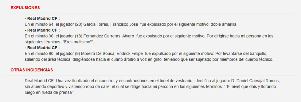 Zu einem weiteren Vorfall, der notiert wurde, sei es dann noch nach dem Schlusspfiff gekommen. Daniel Carvajal habe im Spielertunnel gegenüber Quintero González gelästert: „Ihr zeigt solche Leistungen und dann heult ihr in der Pressekonferenz rum.“